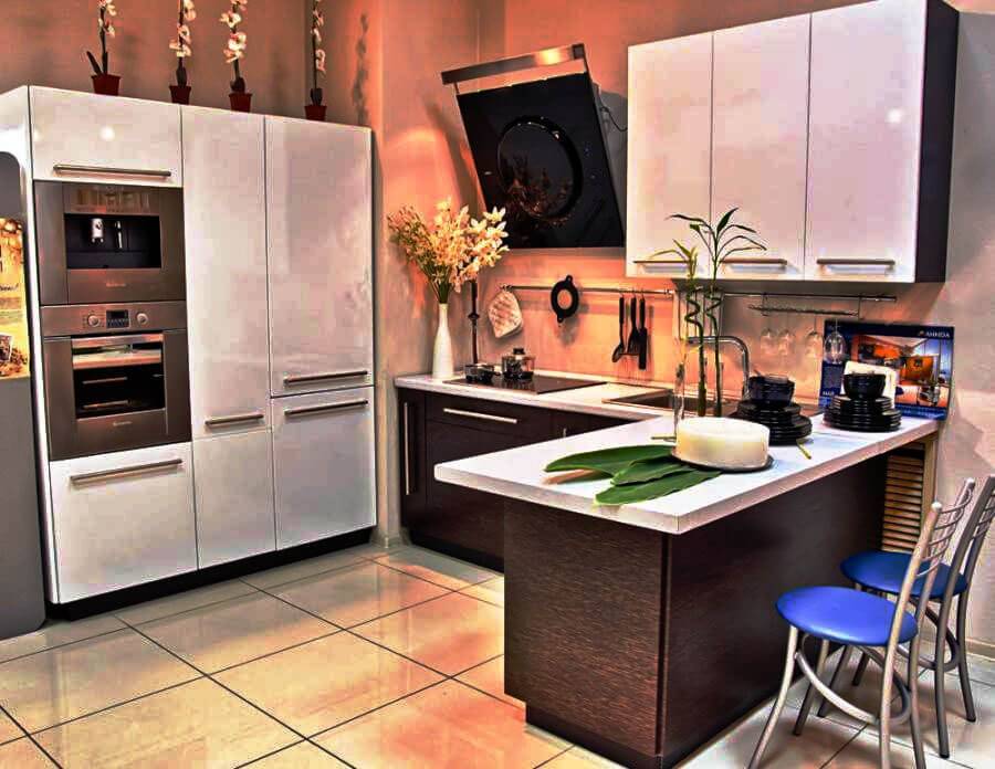 Это идеальный вариант экономии пространства. Органично смотрится сочетание стойки и прямого кухонного гарнитура. Конструкцию особенно оценят энергичные люди, которые немного времени проводят на кухне.