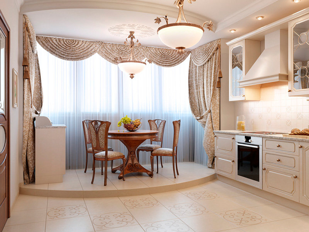 Огромные габаритные шторы не рекомендуется использовать для кухни не зависимо от ее размера. Это связано с тем, что они не только впитывают запахи и быстро загрязняются, но и являются пожароопасными. Тем более умеренное использование их касается маленьких кухонь.