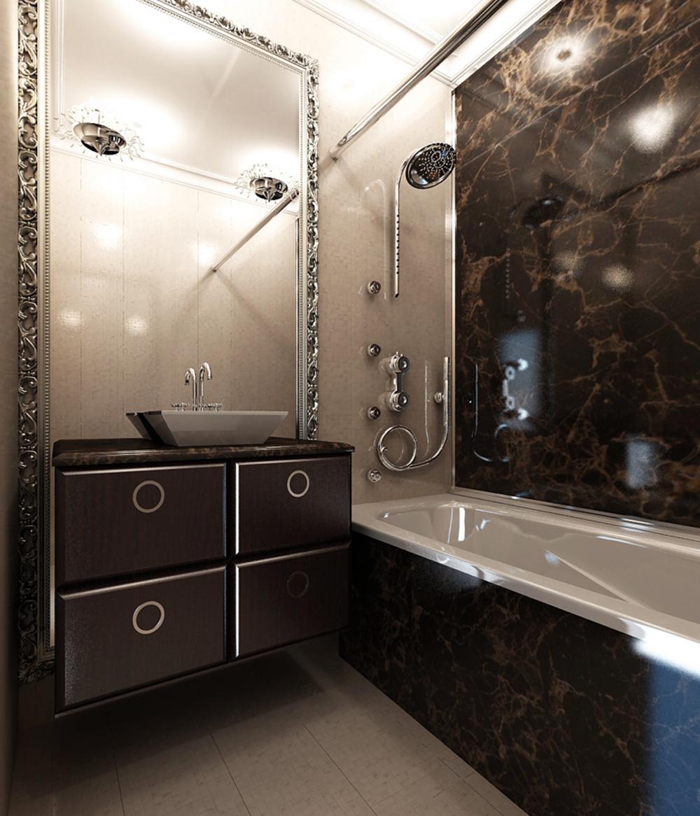 А для отделки стен и пола подойдет плитка под мрамор. Хорошим решением для расширения пространства станет большое зеркало. Отделайте зеркальной плиткой одну из стен и комната наполнится светом и станет визуально больше.