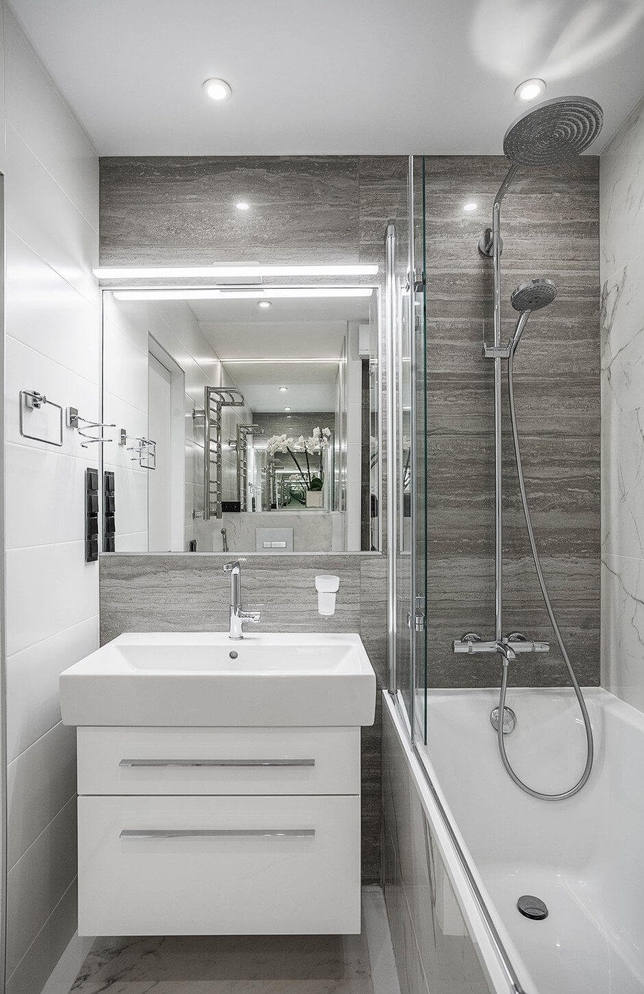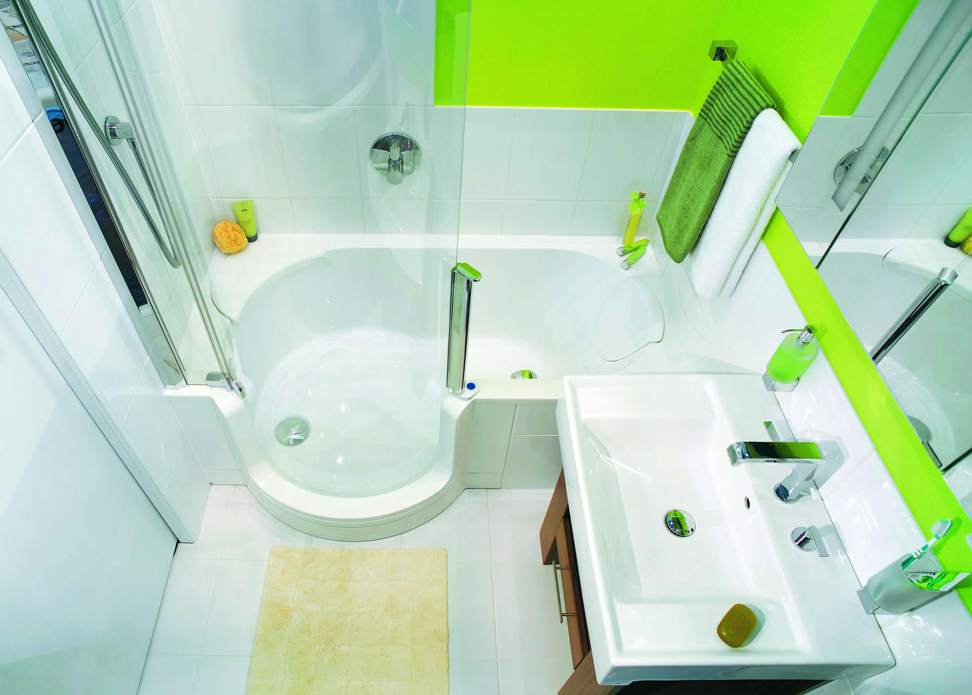 Чтобы выиграть ещё немного места, стандартную ванну можно заменить на угловую или уменьшенную модель, либо поставить душевую кабину. У этого решения есть как плюсы, так и минусы, поэтому каждый вариант необходимо рассматривать индивидуально.