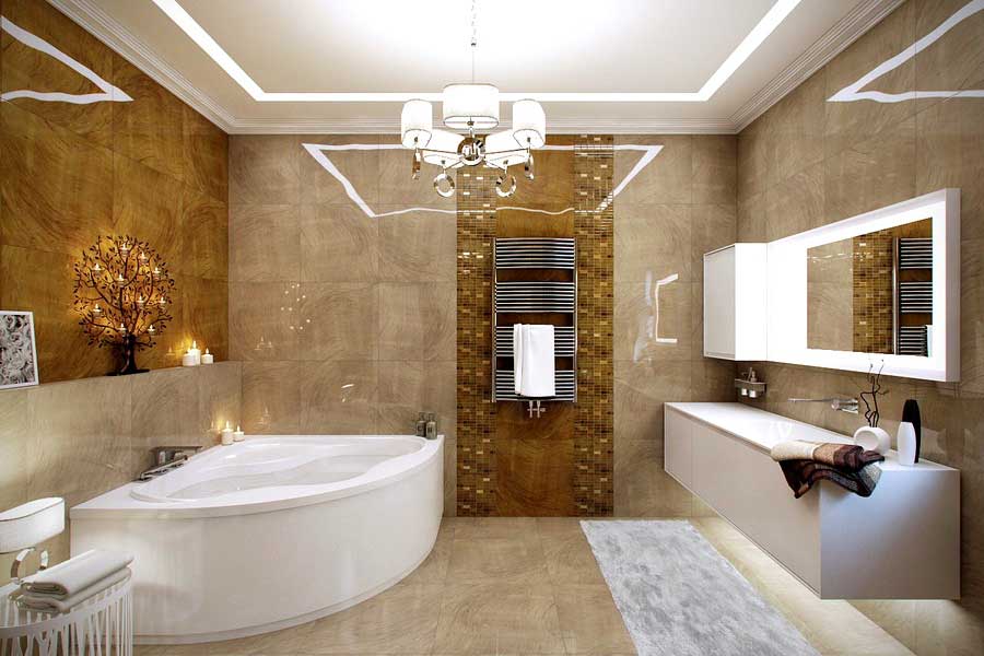 Люстры в коричнево-бежевой ванной комнате без унитаза