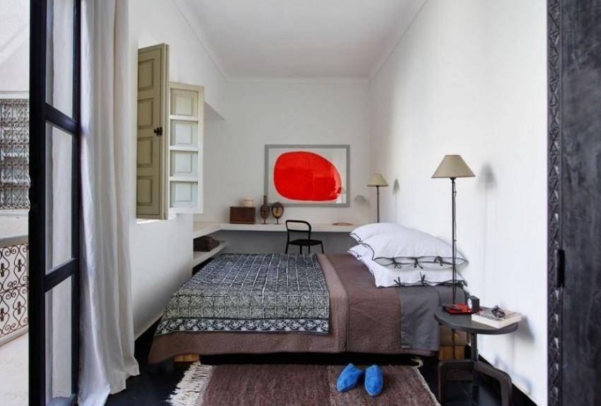 Некоторые владельцы малогабаритных спален предпочитают вместо кровати использовать раскладной диван и даже кушетку (в дневное время ее прячут за шкафом). Подобное решение оправдано, если в спальне планируется размещение рабочей зоны. В этом случае днем ничто не будет мешать свободному перемещению по комнате.