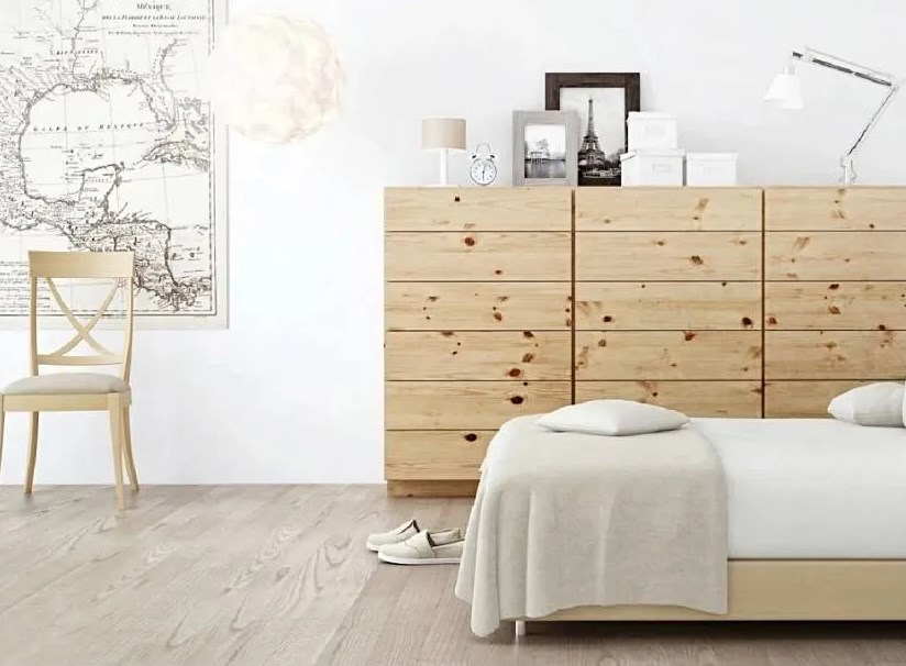Можно использовать встроенный гарнитур с нишей для кровати. Это позволит сэкономить место. Или ящики под кроватью, они вместят в себя массу полезных вещей. Вариант с отдельно стоящим комодом также допускается. Но эта мебель менее вместительна по сравнению со шкафом-купе. Отличная идея – заменить низкими небольшими комодами прикроватные тумбочки.