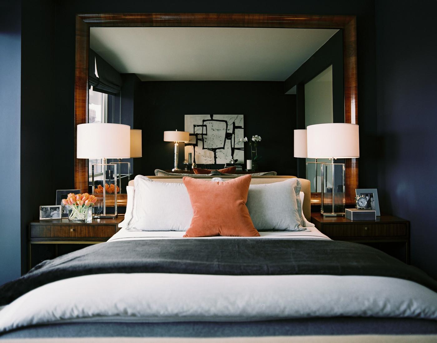 Одна зеркальная дверь шкафа — купе, дверного проема увеличат объем спальни, а маленькие преломляют свет и делают помещение светлее. Если это невозможно, то применяем зеркальные поверхности другого масштаба (панно, витражи). Еще поможет стекло, из-за своей прозрачности и легкости оно не громоздит помещение. В этом поможет журнальный столик и полки из стекла.