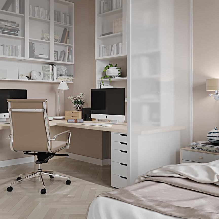 Если есть необходимость в создании рабочего уголка, то данные размеры помещения позволяют не «втискивать» его в свободный угол, а удобно разместить и изолировать от других зон комнаты.