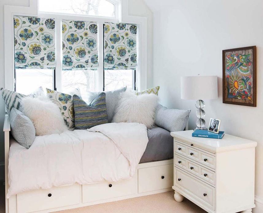 Благодаря текстилю и аксессуарам можно сделать обычную комнату тёплой и уютной спальней. Ориентируемся на светлые тона в контраст к постельному белью, покрывалу. А подушки хорошо смотрятся с яркими принтами и краями.