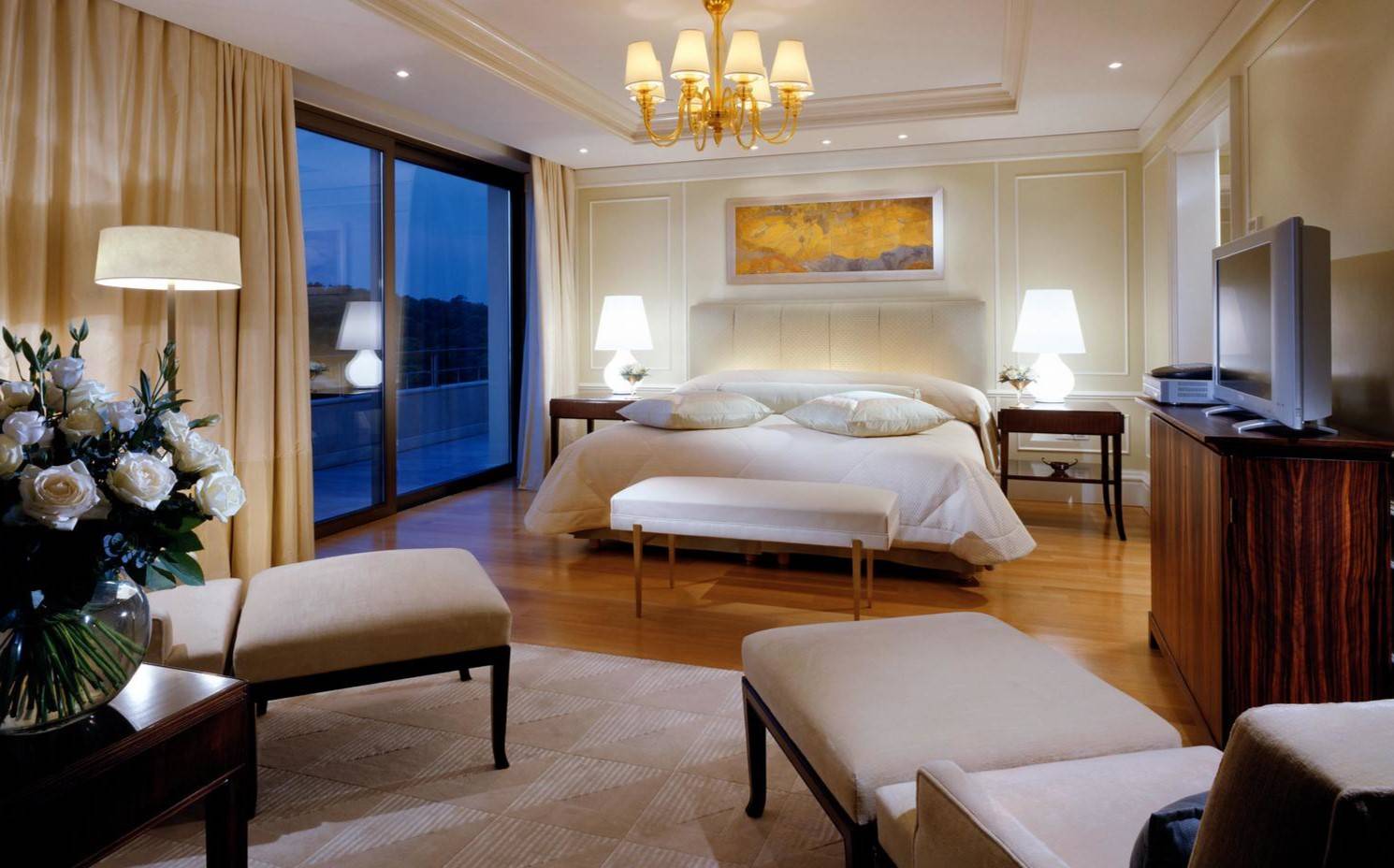 Потолок может быть гладким или иметь несколько уровней. Обязательным декоративным элементом классического интерьера является роскошная потолочная люстра. Дополнить центральное освещение необходимо настенными бра. Для удобства их размещают над изголовьем кровати.