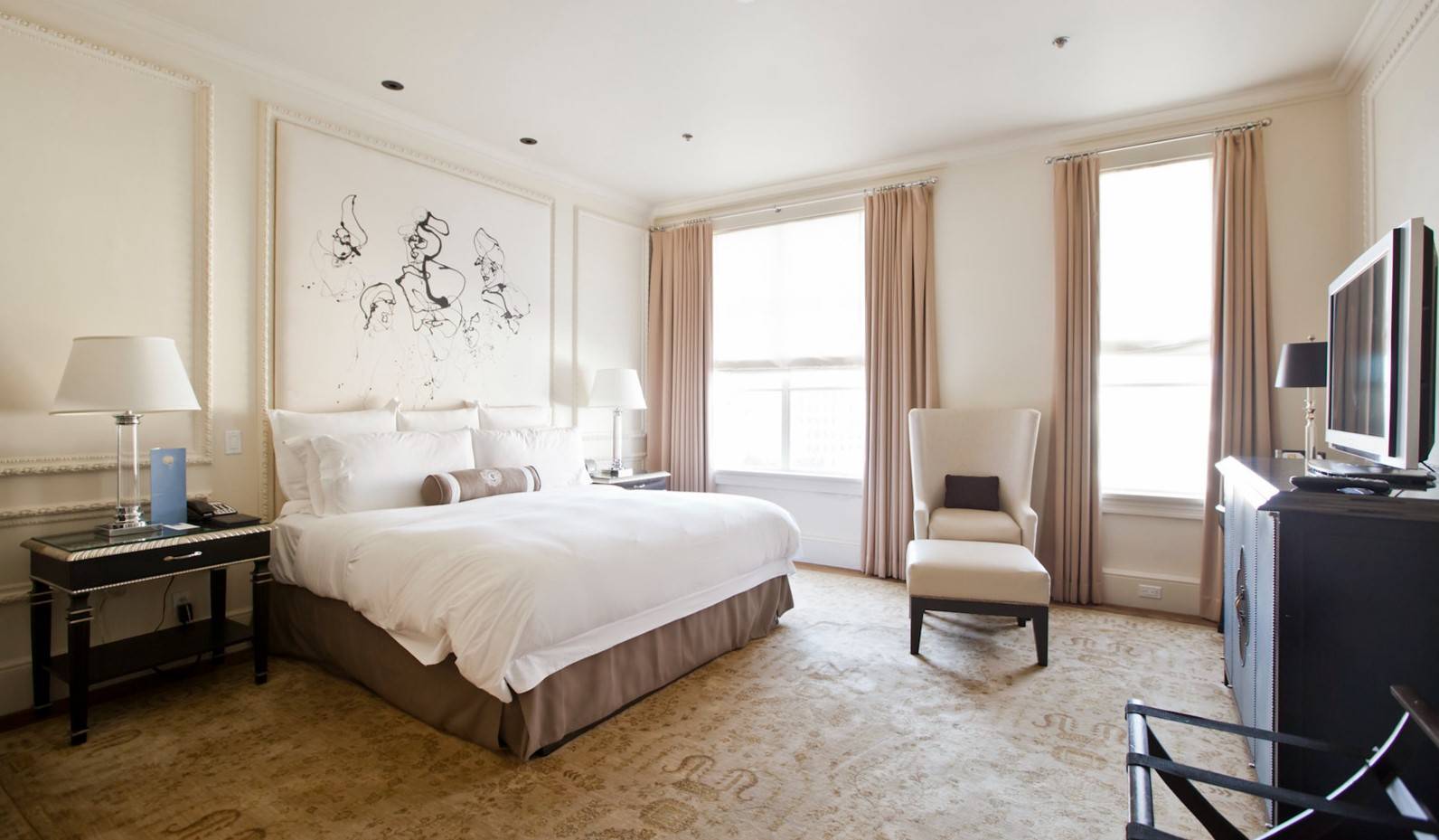 Светлая спальня и контрастные детали. Просто светлая спальня – это уже скучно, но если в интерьер добавить несколько контрастных деталей, она сразу будет восприниматься иначе. В качестве таких деталей лучше использовать гравюры в черных рамках, настольные лампы с черными абажурами, темные плинтуса или какие-то темные элементы декора. Их присутствие сделает интерьер более динамичным, а также это отличный способ подчеркнуть симметрию в комнате.
