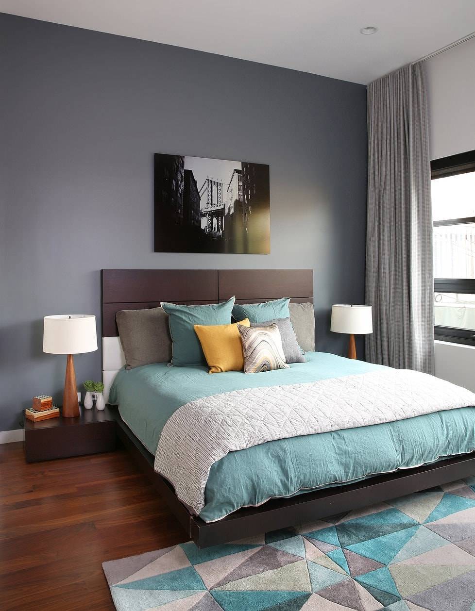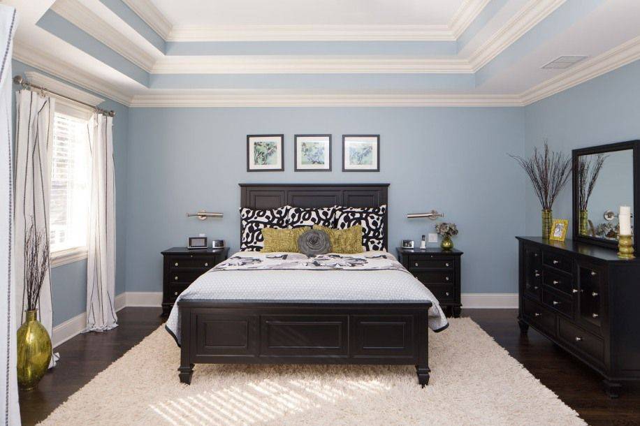 Многие проекты выполняются в двух или трех контрастных цветах. Например, сине-оранжевая спальня смотрится очень эффектно, но при этом сочетание не является тяжелым для восприятия. Более «щадящие» дуэты – бежевый и серый, или персиковый и бежевый.