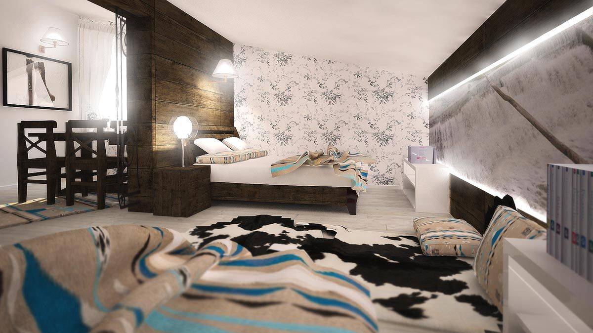 - Полноценная кровать и TV находятся далеко от входной двери, тем самым визуально формируют отдельную зону отдыха.