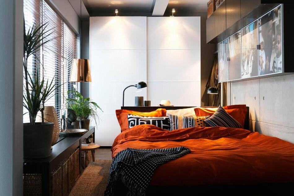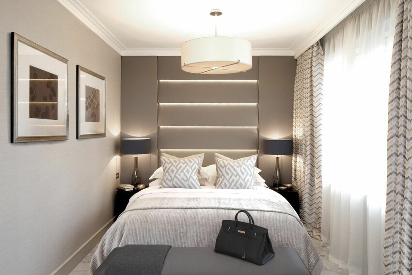 В маленьких узких спальнях рекомендуется размещать кровать напротив стены с окном. Это обеспечит отсутствие проблем с засыпанием и предотвратит попадание прямых солнечных лучей с утра.