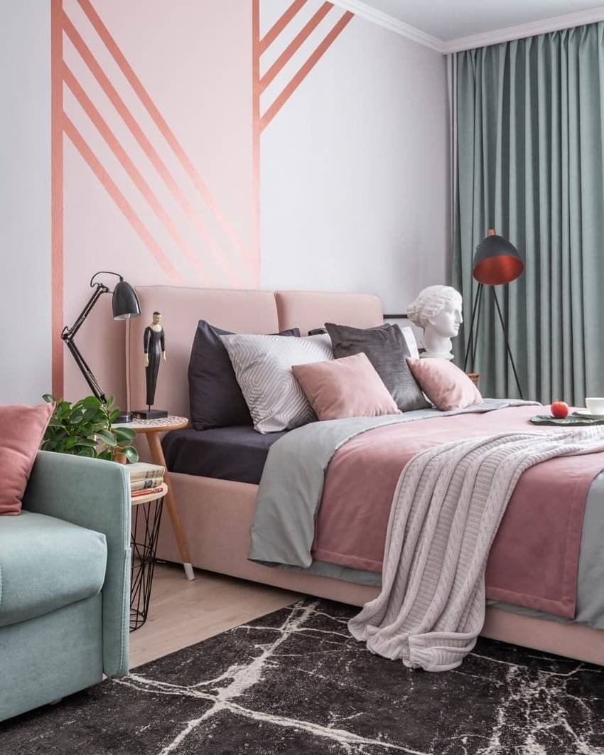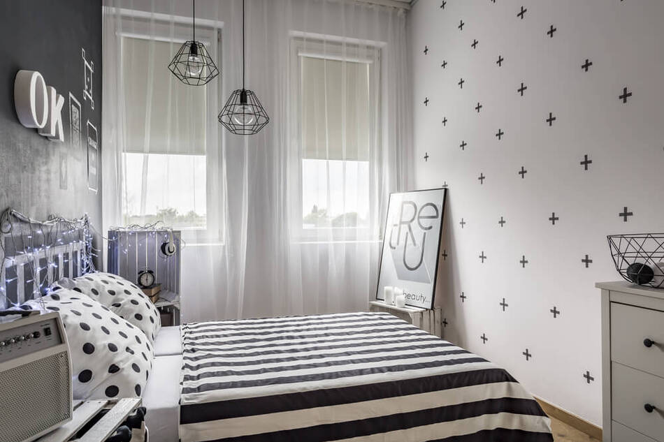 Если в спальне низкий потолок, можно добавить вертикальных полос, которые помогут визуально увеличить пространство.