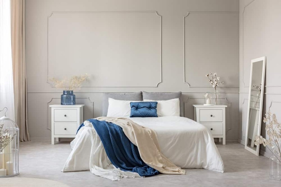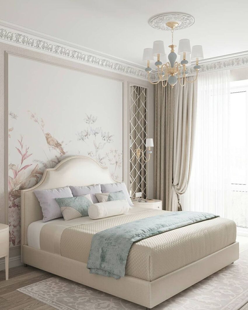 Для отделки используется по большей части белый цвет, который может разбавляться обоями с неяркими принтами и текстилем, добавляющим спальне уюта.