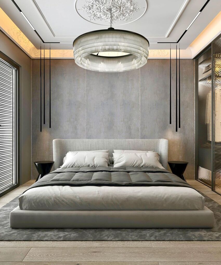 Если потолки не очень высокие, лучше поместить источник света повыше, к потолку. Если же потолок высокий, это позволит разместить даже большую люстру и даст возможность обеспечить освещение потолка по периметру. В спальнях с высоким потолком очень богатые возможности для настройки точечного освещения, благо сверху простора достаточно.