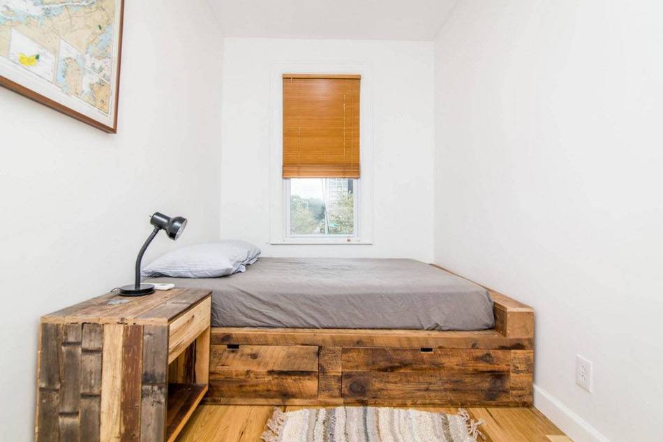 Например, установи кровать с подиумом. Встроенные в него полки могут хранить одеяло, постельное, сезонные вещи или даже любимые заготовки на зиму.