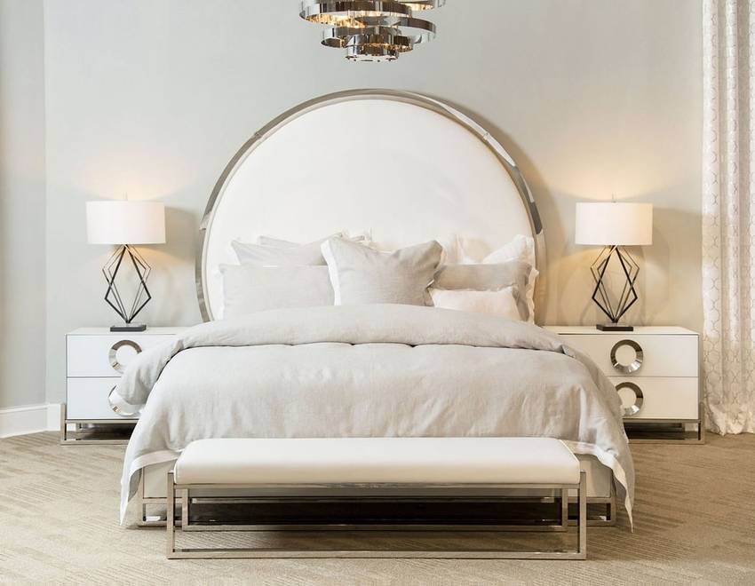 Современный стиль предполагает использование хромированной фурнитуры, полированного дерева, зеркал, что позволяет сделать спальню визуально более просторной.