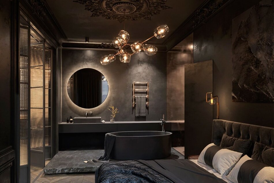 Темная спальня, да еще и с ванной — настоящий вызов стереотипам