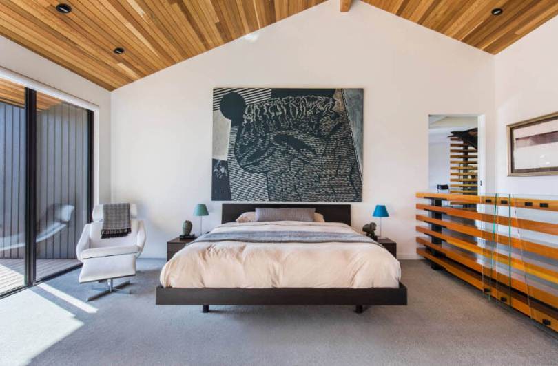 Просторная спальня в частном доме может служить не только местом отдыха, но и зоной для деятельности, увлекающей хозяев коттеджа. Также можно создавать объемные зоны для хранения вещей.
