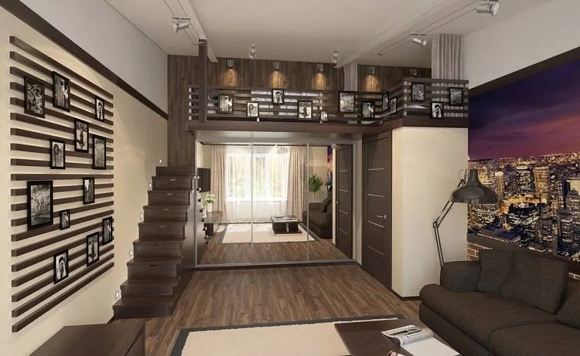 Размещение кровати-чердака позволяет оборудовать на площади 20 квадратных метров не только гостиную, но и рабочую зону. Это особенно актуально при создании дизайна интерьера в однокомнатной квартире.