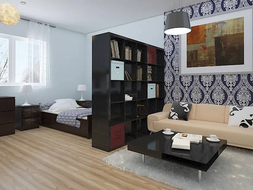 Стеллажами для книг или одежды можно разделить помещение на зоны, сэкономив при этом пространство. Такой вид перегородок может иметь различную высоту. Невысокие полки отделяют спальню от зала частично, стеллажи высотой до потолка полностью разделяют функциональные зоны.