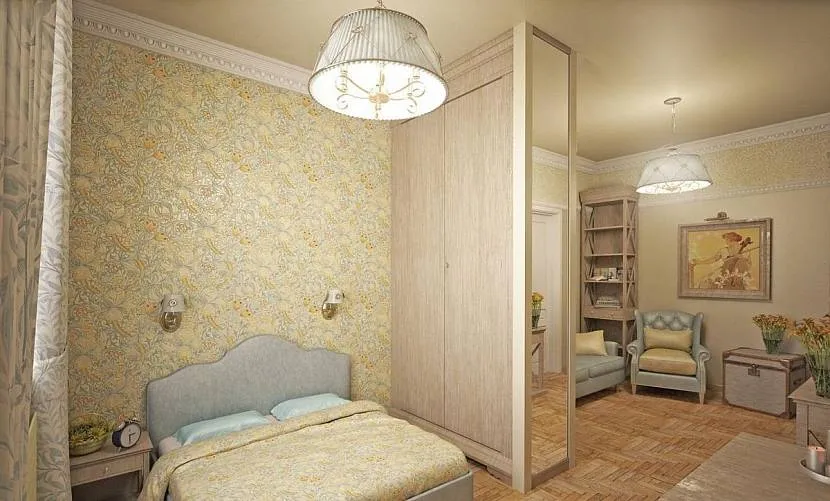 - для визуального расширения пространства используется панорамное окно или шкаф-купе с большим зеркалом на дверцах;