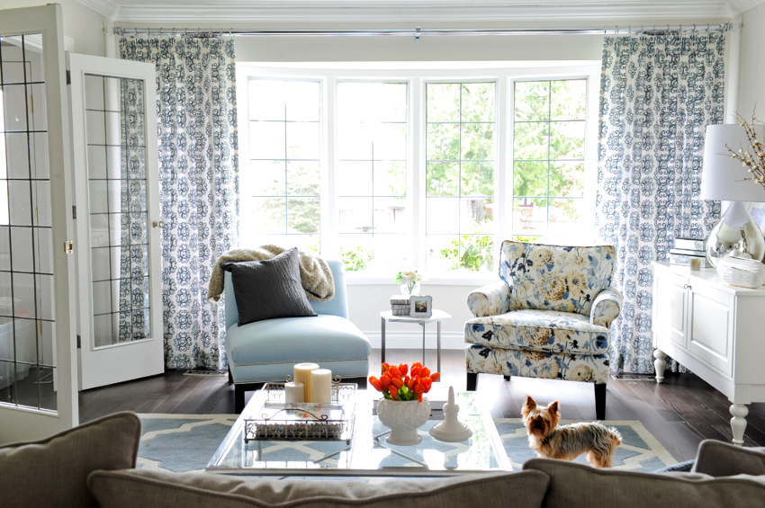 Для оформления окон белых гостиных можно применять изделия с рисунком