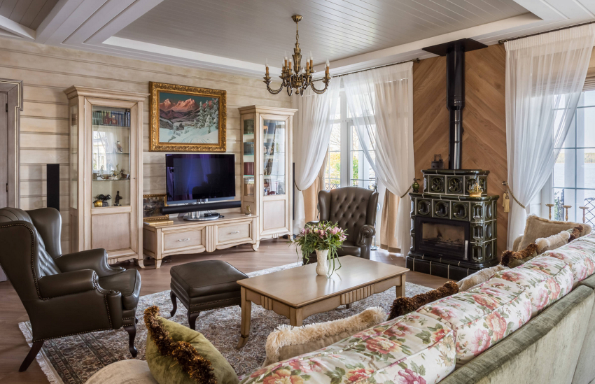Если гостиная оформлена в классическом стиле, то рекомендуется приобрести красивые подхваты с кистями. Ткани для штор лучше использовать с золотым рисунком, а материал должен быть дорогим. Портьеры должны иметь богатый, роскошный вид.