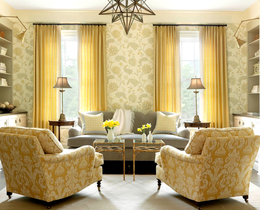 Для гостиной в сером цвете подойдут теплые и сочные оттенки. Это могут быть персиковые или розовые, желтые шторы. Такие шторы создадут уют в комнате, сделают ее светлее.