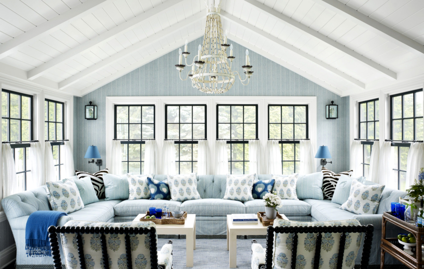 Неглубокий серый, бледный фисташковый, чистый голубой оттенки украсят интерьер гостиных холодного белого цвета.