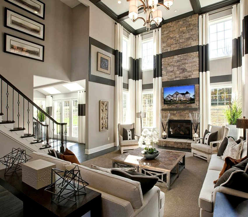 При оформлении дизайна окон в гостиной длинными шторами необходимо установить карниз на высоте не менее 300 см