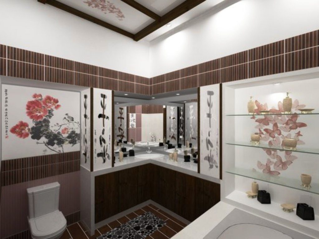 | Японский | В данном направлении применяют контрастные детали в отделке стен. Обычно делают темными углы. Они визуально расширяют пространство. Полки изготавливаются в минимализме без створок. Задействуется натуральное дерево, металл, керамогранит. По одной стороне располагают ванну, а напротив — унитаз и умывальник на отдалении друг от друга 50-70 см. |