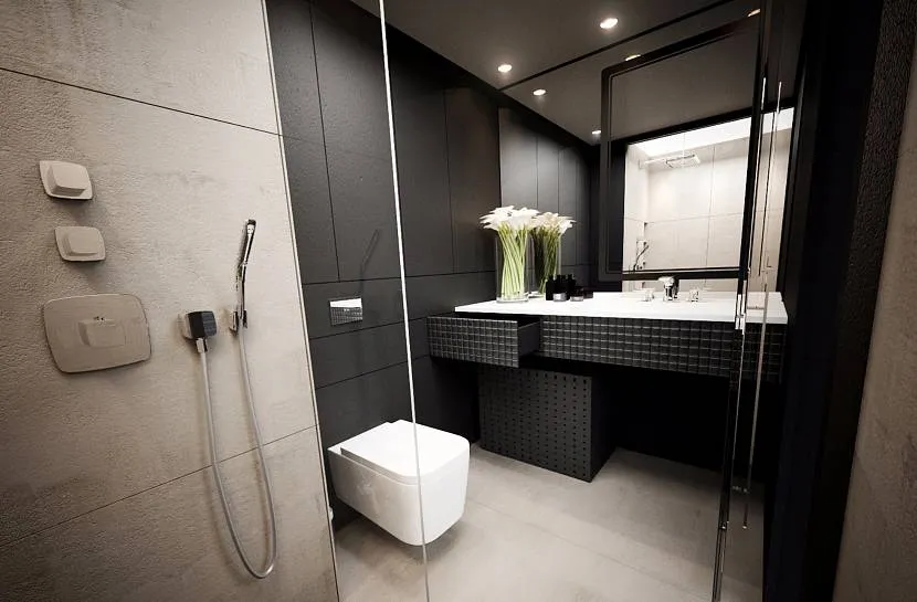 Совмещенный санузел в стиле минимализм в черном цветеИсточник vip-1gl.ru