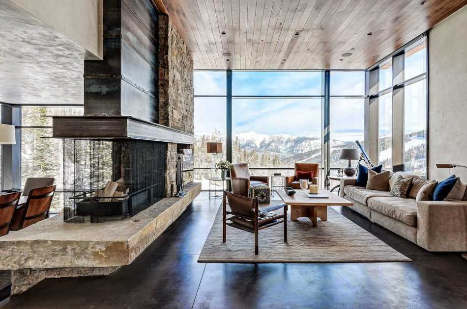 Натуральное дерево и камень относятся к наиболее предпочтительным материалам для отделки гостиной, находящейся в частном доме.