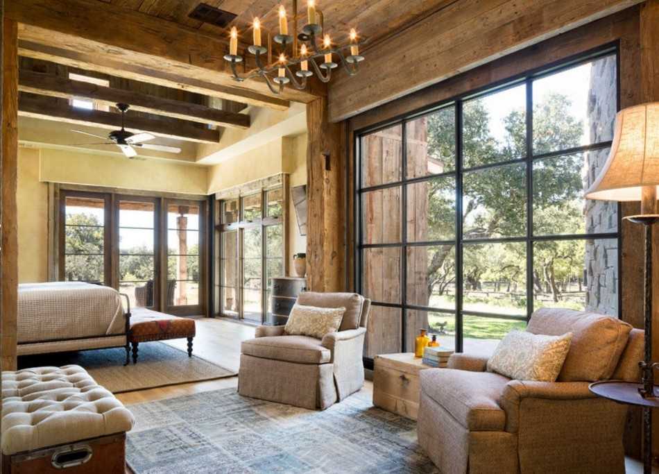 Прозрачные окна загородного дома, расположившегося на берегу моря или реки, придают интерьеру помещений незабываемый эффект.