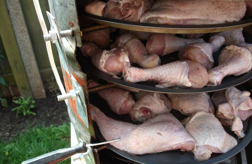 - На последнем этапе нужно вставить внутри стержни для емкости сбора жира и решетчатые полочки для мясных кусков.