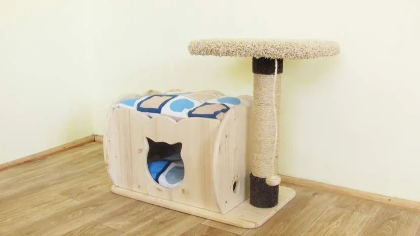 - Удовлетворять инстинктам. Если животное подвижное, с удовольствием играет, целесообразно совместить домик с игровой зоной, или хотя бы дополнить его парой разноуровневых площадок. Рекомендуется также устанавливать рядом когтеточку; в выигрыше будут все.