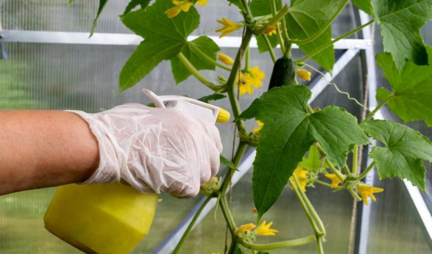 Полученными питательными растворами можно также опрыскивать и листья огурцов. Это поможет защитить молодое растение от различных вредителей и вредоносных бактерий, а также на длительное время сохранит зелёный цвет листьев.