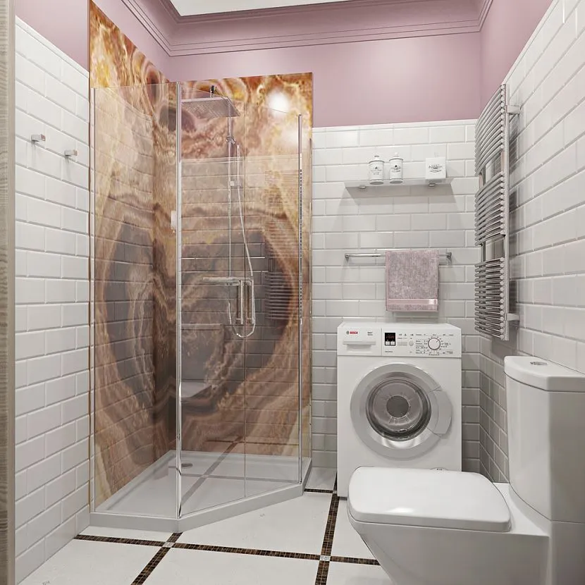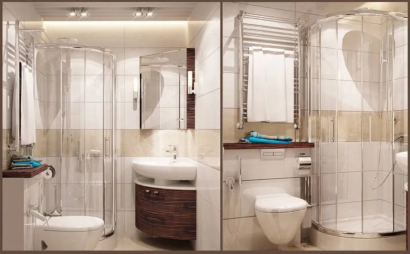 Ванная с душевой кабинкой в одинаковом стиле, но разных оттенках. Стеклянная кабинка с раздвижными дверцами не занимает много места. В такой тесноте создают единую канализационную систему для всех источников. Зону над унитазом дополняют шкафчиком с нишей.