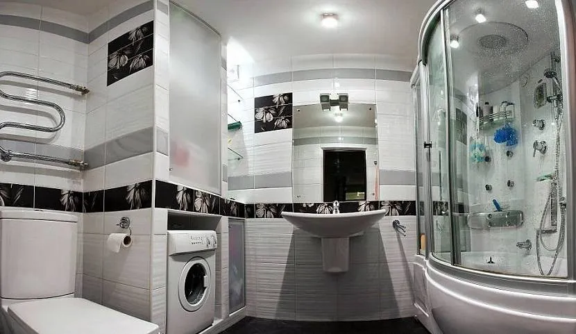 В современном дизайне часто используют контрастную облицовку. Особенно актуально применение стиля в малогабаритных ванных. Небольшой умывальник с зеркалом ставят между душевой кабиной и унитазом. Над последним размещается полотенцесушитель. Машинка автомат встраивается в заранее подготовленную нишу. Роль корзины для грязного белья отдается специальному шкафчику с матовой дверцей.