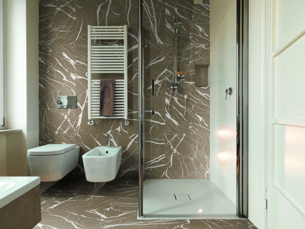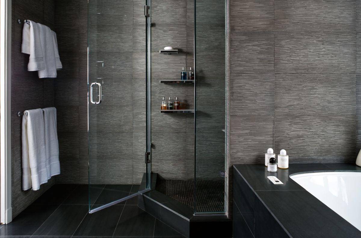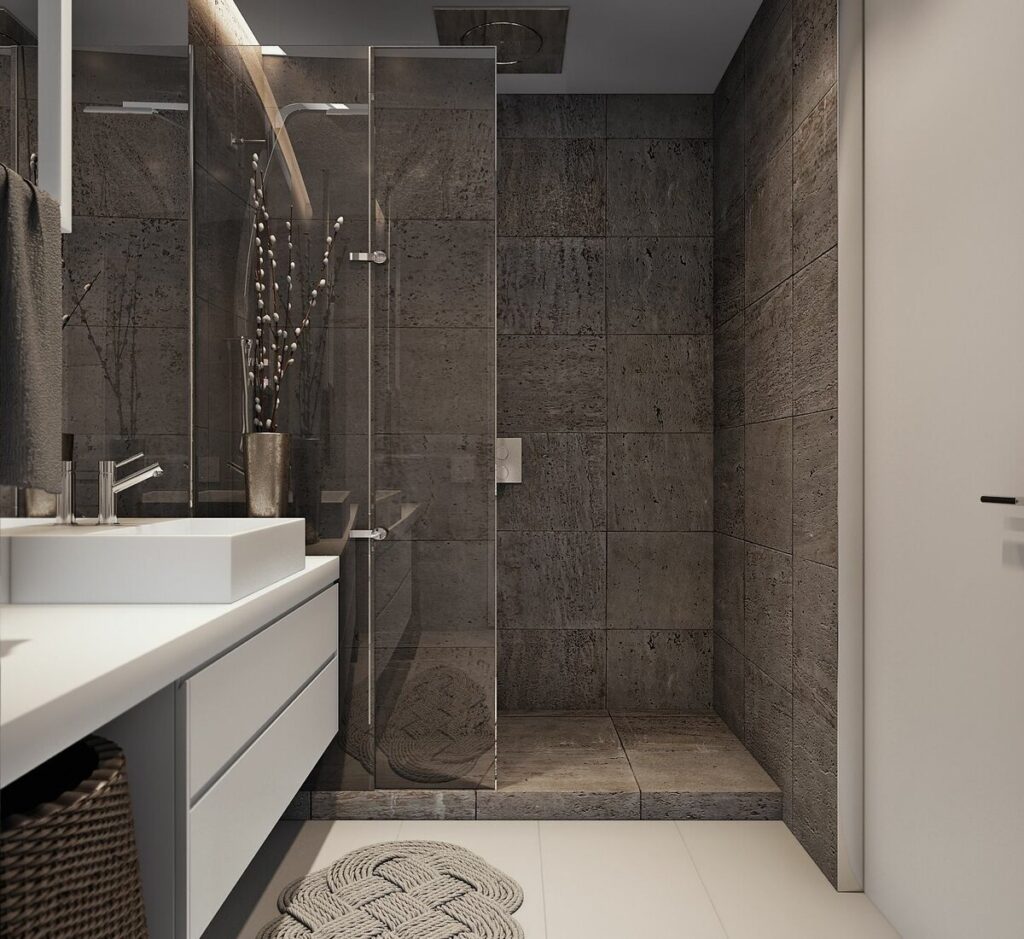 Чистые цвета, отсутствие декора и принтов, максимум открытого пространства – вот основные признаки этого стиля. Здесь боксы также используются редко. В крайнем случае выбираются лаконичные модели с низким дном, максимальным остеклением и отсутствием задней стенки. Чаще душевые уголки оформляются стеклянной перегородкой, которая практически незаметна на общем фоне. Цветовая гамма таких интерьеров включает серый, коричневый, белый, черный цвета. В качестве обстановки используются зеркала без рам, мебель с хромированной фурнитурой или совсем без ручек, подвесная сантехника.