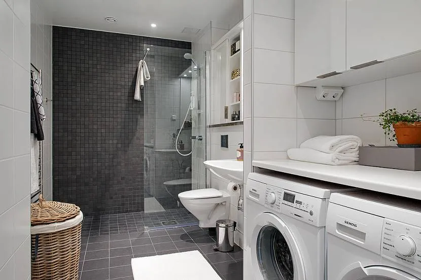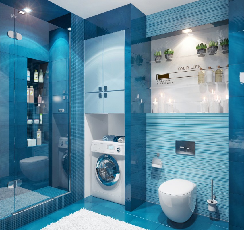 - При выборе угловой модели ванны или душевой кабины вы найдете место для установки эргономичной стиральной машины. Даже если места совсем мало, можно установить стиральную машину под раковину, тем самым освободив пространство для подвесного унитаза или инсталляции.