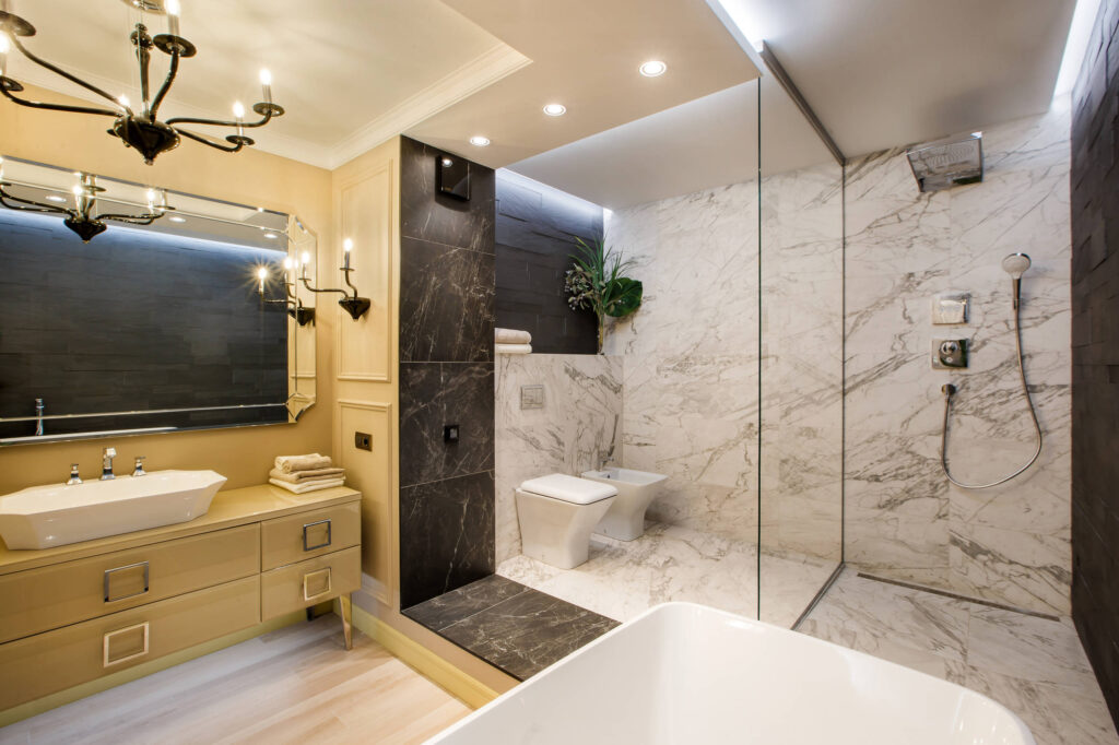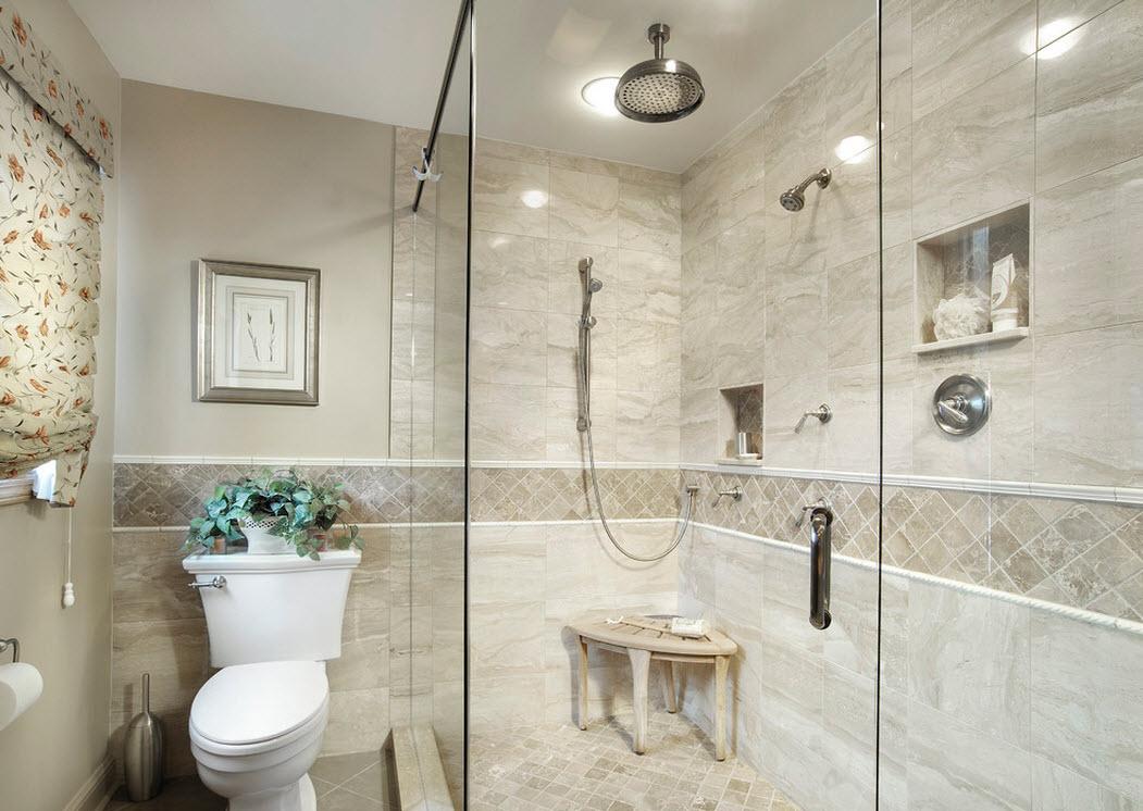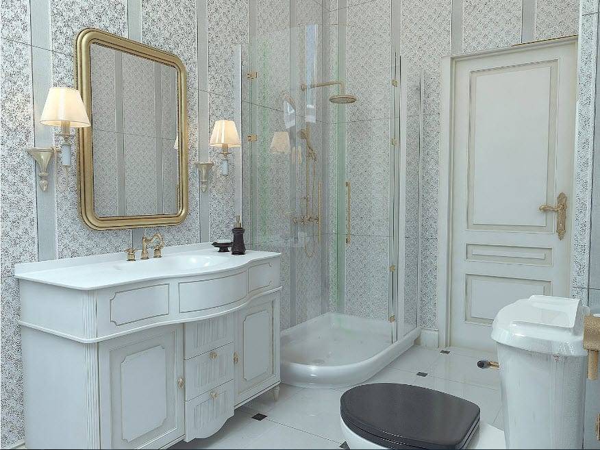 Классика остается в тренде. Дизайн ванной комнаты с душевой кабиной и туалетом смотрится привлекательно в помещении любой площади.