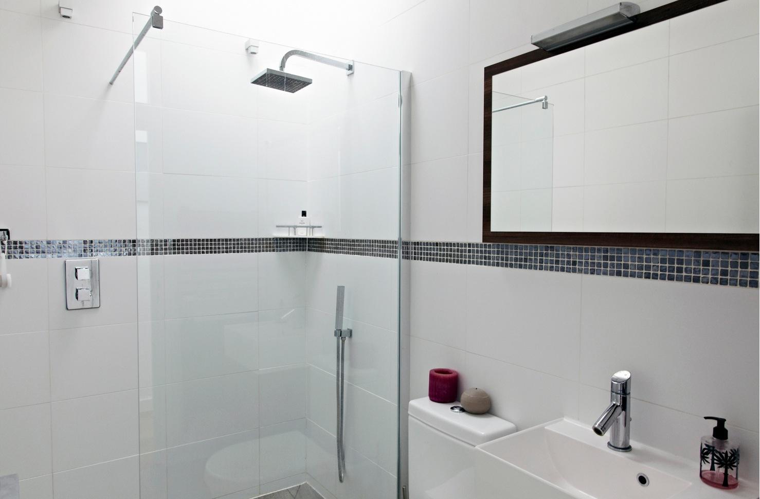 Вот так выглядит дизайн ванной с душевым уголком прямоугольной формы. Конструкция устанавливается между двумя стенами или крепится к одной из них. На фото ниже хорошо видны особенности душевой открытого типа.