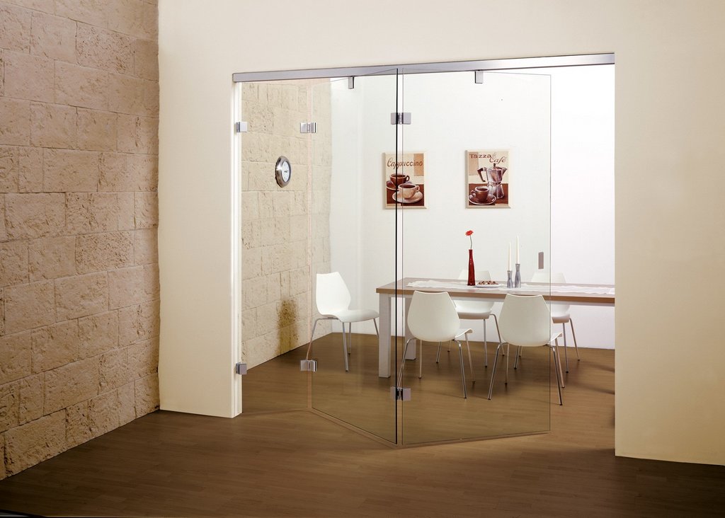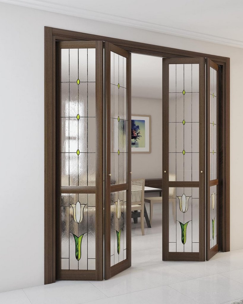 Стеклянные раздвижные двери позволяют сделать любое помещение визуально более просторным и будут уместны как на кухне, так и в гостиной. Прочное стекло, из которого они изготовлены, может быть рифленым, матовым, прозрачным, зеркальным, с рисунком или пескоструйной гравировкой. Кроме эффектного внешнего вида, преимуществом стеклянных дверей-гармошек является водостойкость, неподверженность коррозии и долговечность.