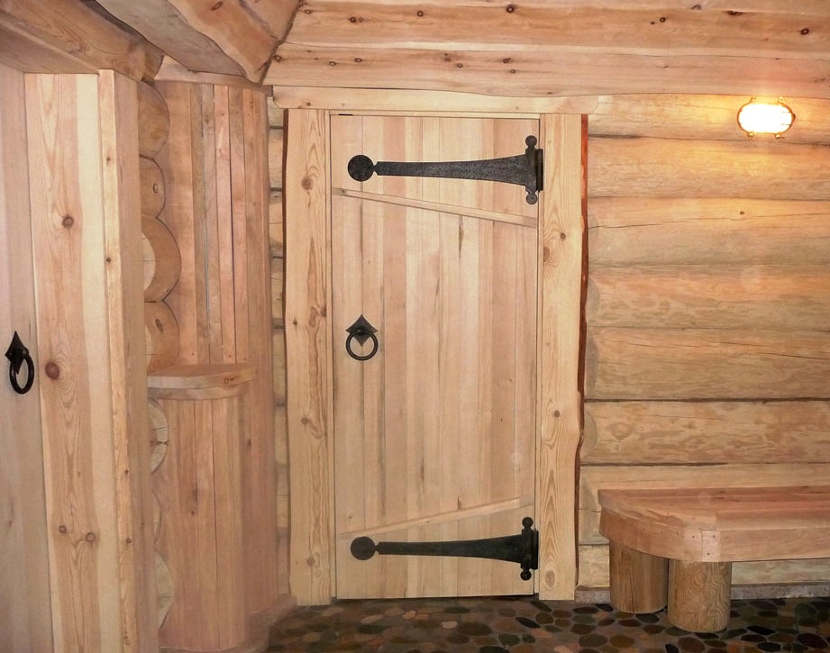 Требования к входной двери немного проще, нежели к двери в парную, размеры последней значительно отличаются от общепринятых. Это необходимо для сохранения тепла. Дверная фурнитура должна быть исключительно деревянной, кроме крепления дверей. Распахиваться банные двери должны только наружу, это касается как входной, так и к остальным дверей бани.