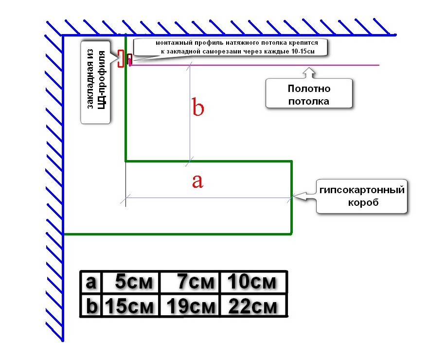 Внутри конструкции из листов гипсокартона закреплен натяжной потолок