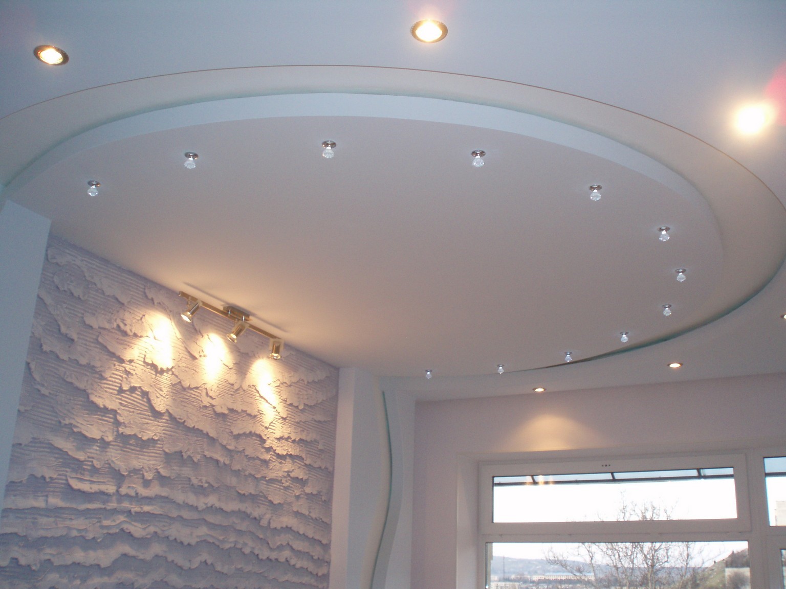 С технической точки зрения, самый сложный вид. Сочетая прямые и кривые линии, дизайнеры создают любые замыслы. Использование подсветки позволяет делать акценты на имеющихся рисунках, фигурах, фактурах.