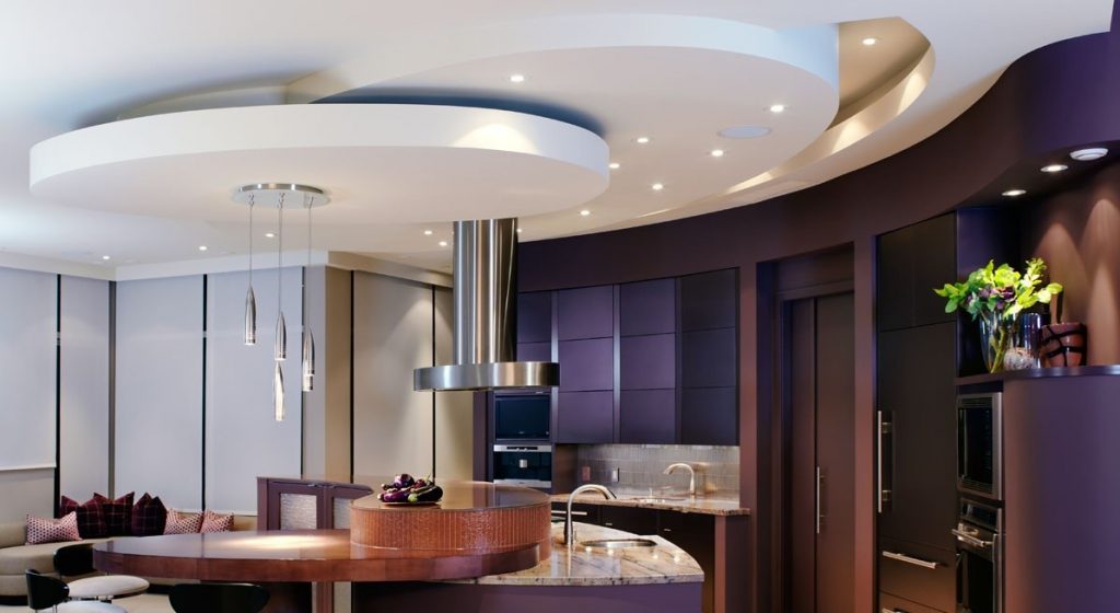На самом деле, этого стоит бояться только владельцам кухонь с очень низкими потолками — до 2,5 метров. Если высота стен примерно на этом уровне, то стоит выбирать дизайны, когда элементы гипсокартона установлены по периметру комнаты. Начиная с 2,7–2,8 метров, можно позволять себе любые дизайнерские решения.