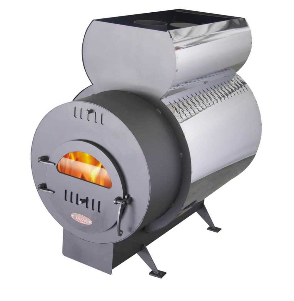 - Банные печи на дровах с парогенератором. Для нагрева воды и камней применяется твердое топливо. Запах горящей древесины создает особую атмосферу в парилке. Оборудование особенно востребовано у поклонников традиционной русской бани.