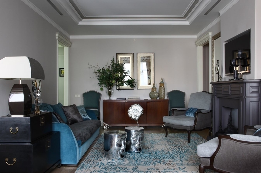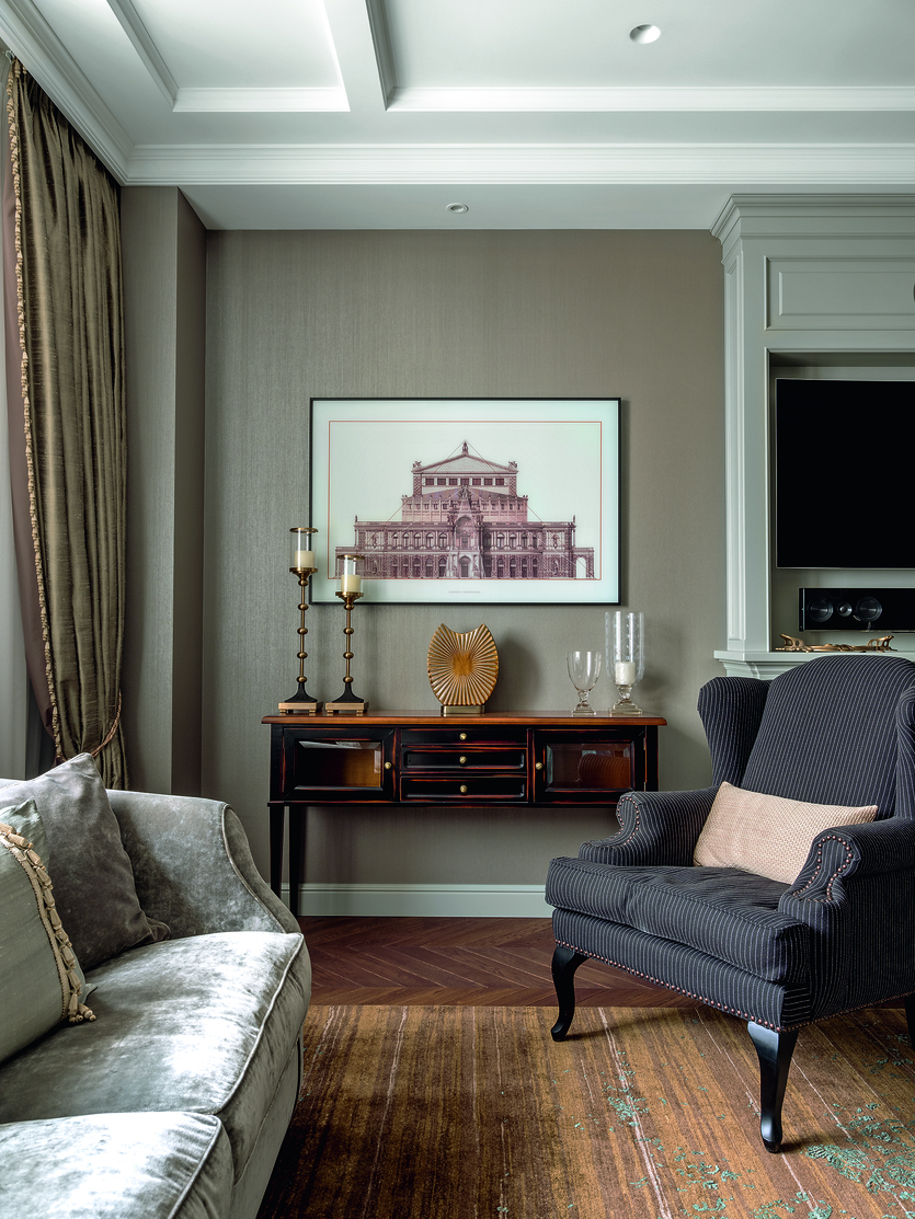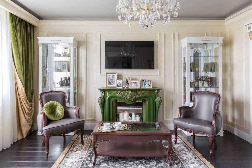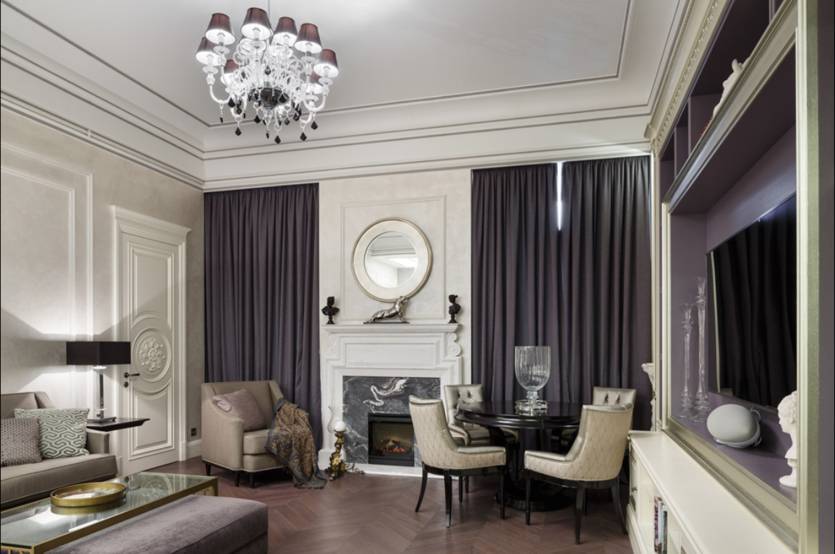 Высокая классика предполагает, каминные порталы, обрамленные натуральным камнем, украшенные коваными, резными элементами, лепниной или полуколоннами. Тв-плазмы часто встраивают в дорогую мебель или декорируют под картины с помощью грациозных молдингов или багетов.